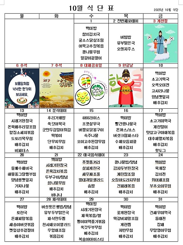 2025년 10월 식단표 ^^ 페이지 정보 작성자 관리자 작성일25-09-30 08:53 조회138회 댓글0건 이전글 다음글 목록 본문 10월에는 이용인 자조모임 희망 식단, 희망 간식을 최대한 반영하고, 잔반제로데이, 분식데이, 태국음식데이, 채식데이를 선정하여 보다 다채로운 음식을 제공해드리려고 합니다. 맛있게 먹고 열심히 일하겠습니다. ^^ 이전글 다음글 목록