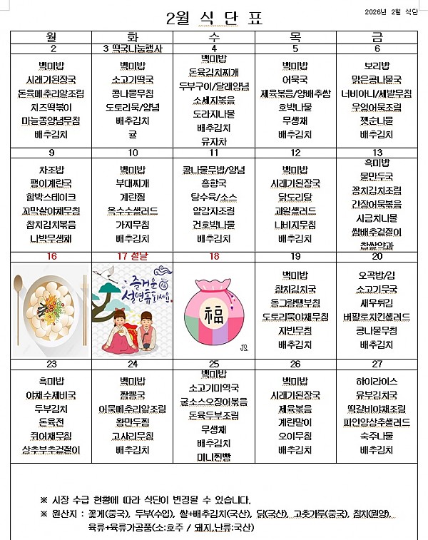 2026년 2월 식단표 ^^ 페이지 정보 작성자 관리자 작성일26-01-29 14:46 조회66회 댓글0건 이전글 다음글 목록 본문 2월에는 입춘도 있고, 설 명절도 있습니다. 2월에도 건강한 음식을 맛있게 먹고 열심히 일하겠습니다. 이전글 다음글 목록