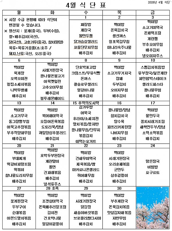 2026년 4월 식단표 ^^ 페이지 정보 작성자 관리자 작성일26-03-31 16:13 조회79회 댓글0건 이전글 다음글 목록 본문 꽃이 완연하게 피는 따뜻한 4월입니다. ^^ 좋은 재료로 만든 맛있는 음식을 잘 먹고 건강하게 생활하겠습니다. 이전글 다음글 목록