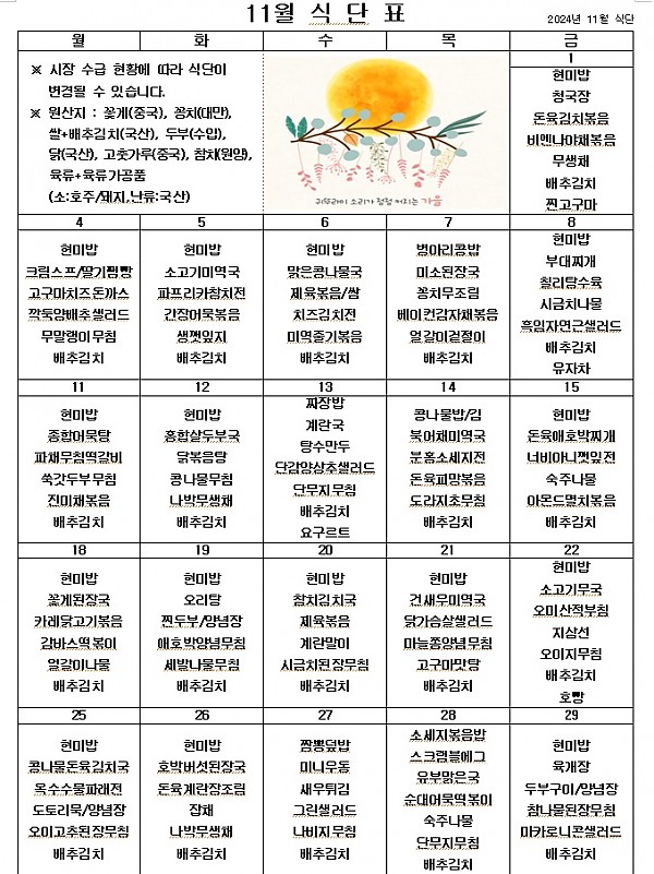 2024년 11월 식단표 ^^ 페이지 정보 작성자 관리자 작성일24-10-31 13:19 조회1,638회 댓글0건 이전글 다음글 목록 본문 힘차게 달리다 보니 벌써 11월이 되었습니다. 11월에도 맛있게 먹고 힘내서 열심히 일하겠습니다. ^^ 이전글 다음글 목록